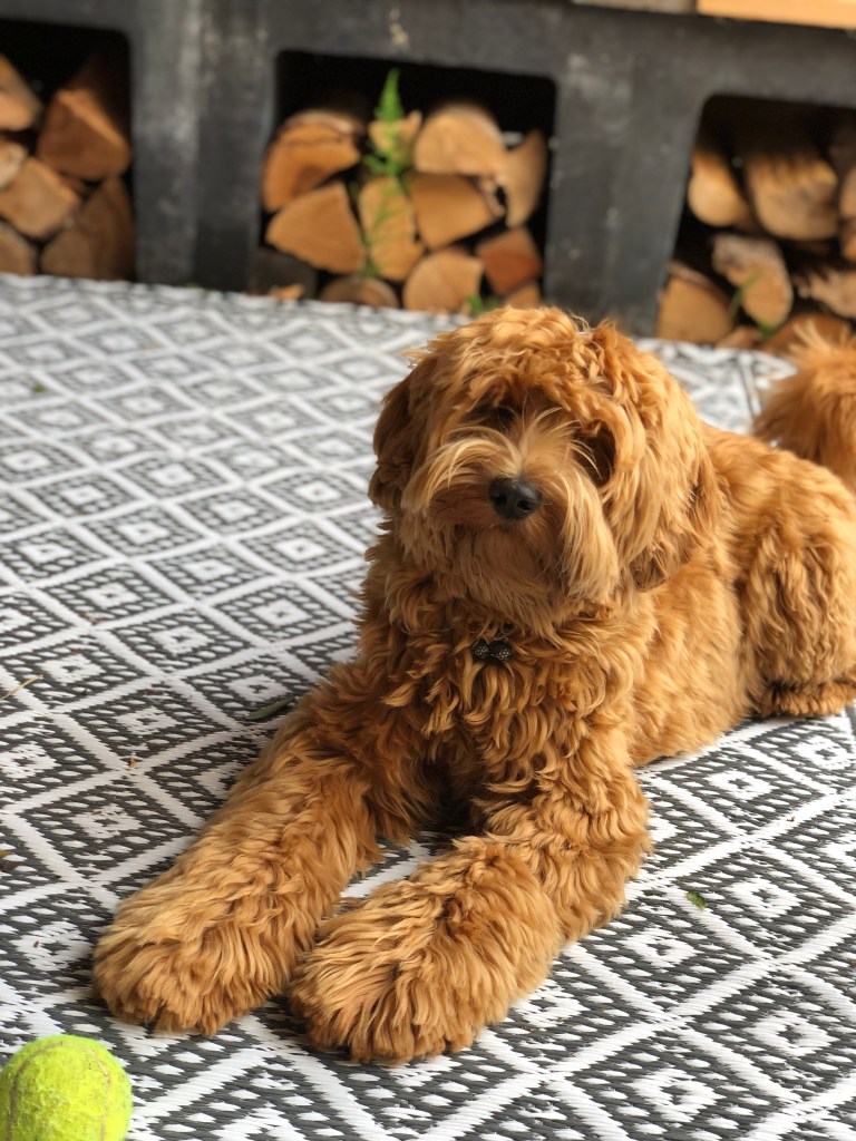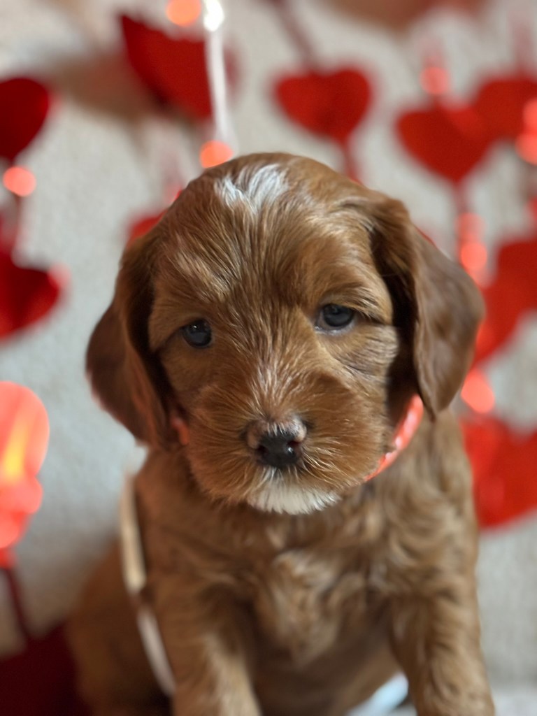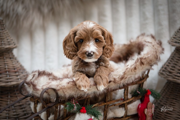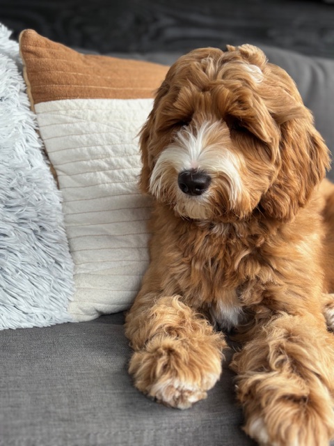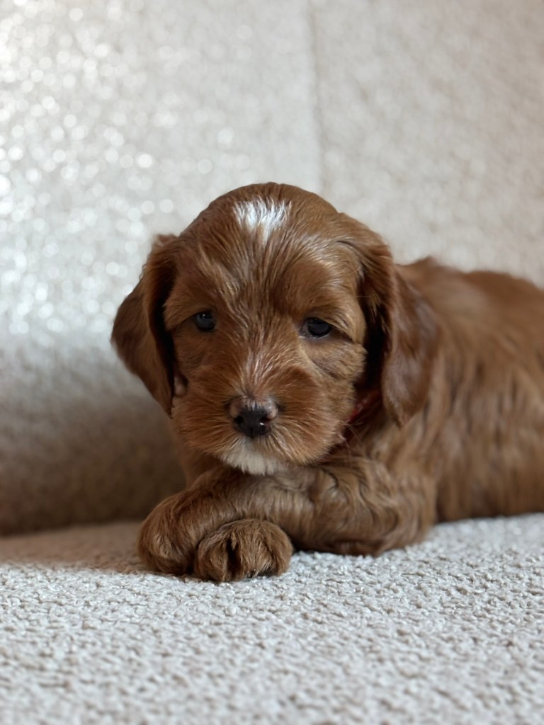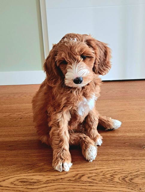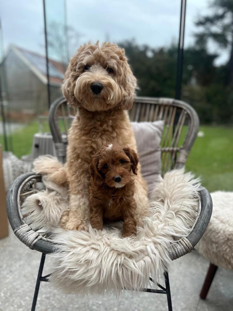 Minnie is een dochter van Bella, onze toekomstige knappe doodle mama voor de toekomst. Minnie is super lief, ze blijft de hele tijd bij je en kijkt graag de kat uit de boom. Haar vacht is heel donkerrood met een prachtige witte tekening. Ook haar pootjes en puntje van haar staart zijn wit. Ze is door de keuringen heen met haar vriendinnetje Lola. Ze groeit op in een heel mooi gezin met 2 kinderen dichtbij ons. Als je Minnie aait, valt ze gewoon in slaap! Wij kunnen niet wachten op kleine Minnies!
