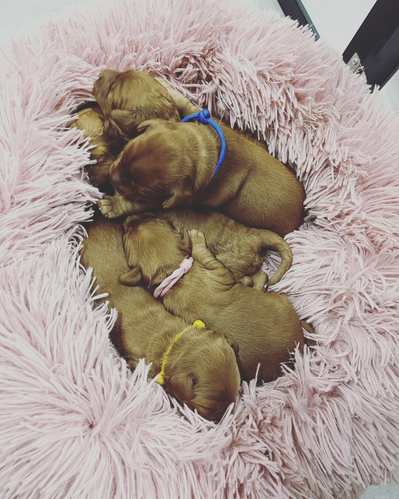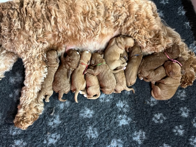 Bella is 3 oktober overdag bevallen van 5 mooie donker rode pupjes. 3 teefjes en 2 reutjes.